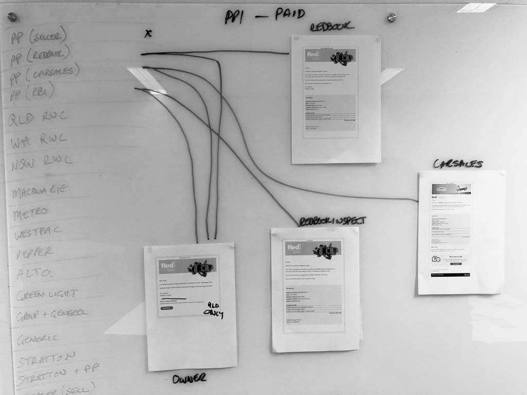 RedBook Inspect had numerous email templates with minor differences, so redesigning each one individually wasn't efficient. Instead, we gathered all the existing emails and laid them out on a whiteboard to visualise their flow.