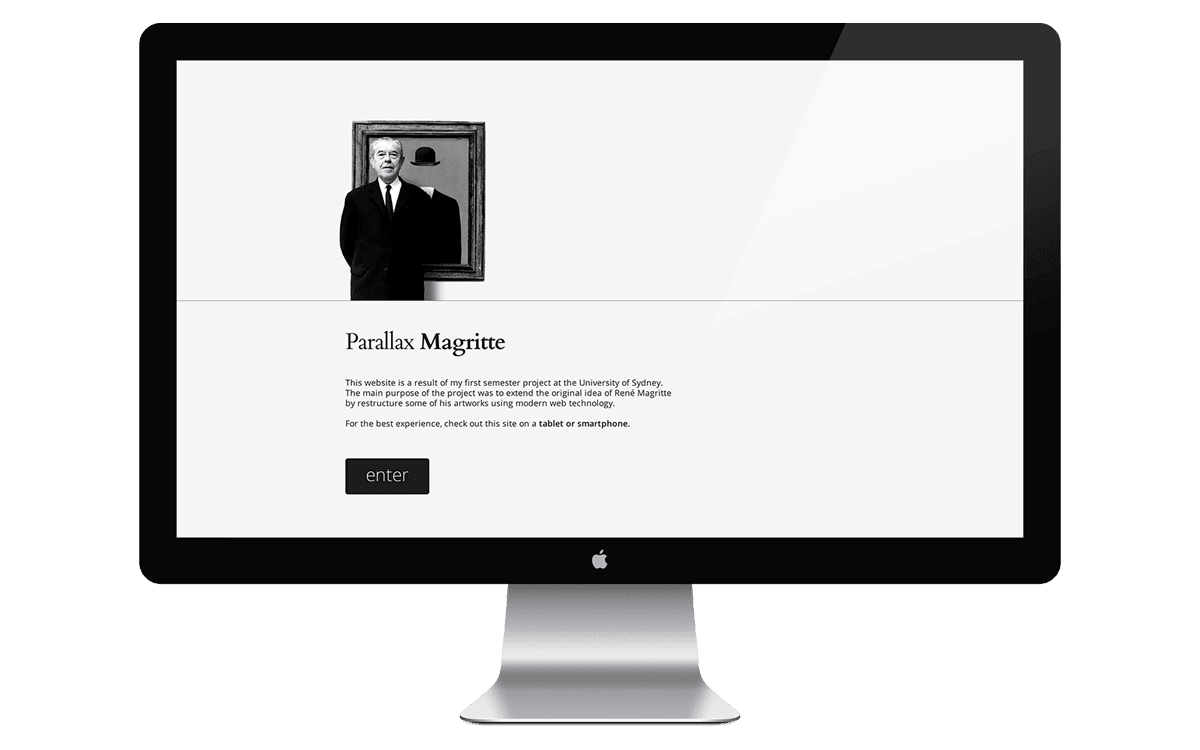 Parallax Magritte is a web experiment that transforms René Magritte's artworks into a 3D space. This allows viewers to see previously unseen parts of the original paintings by tilting their tablets or smartphones.