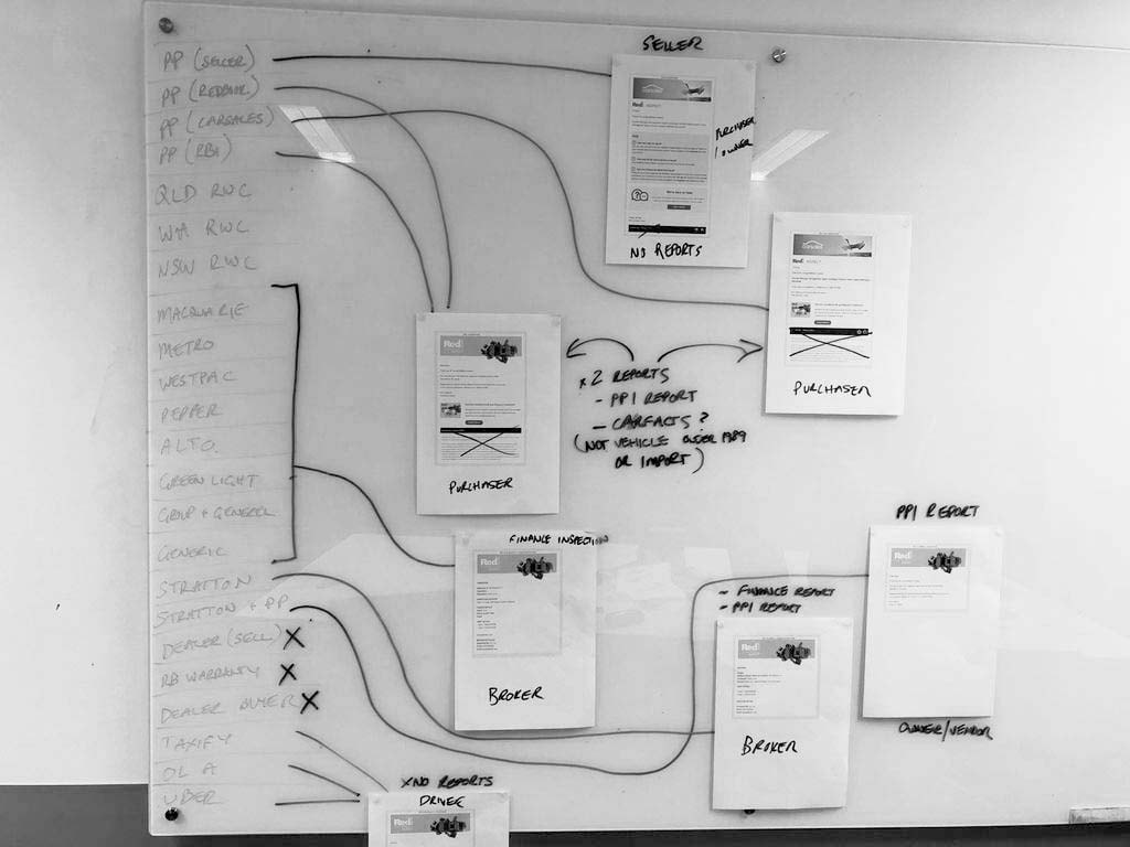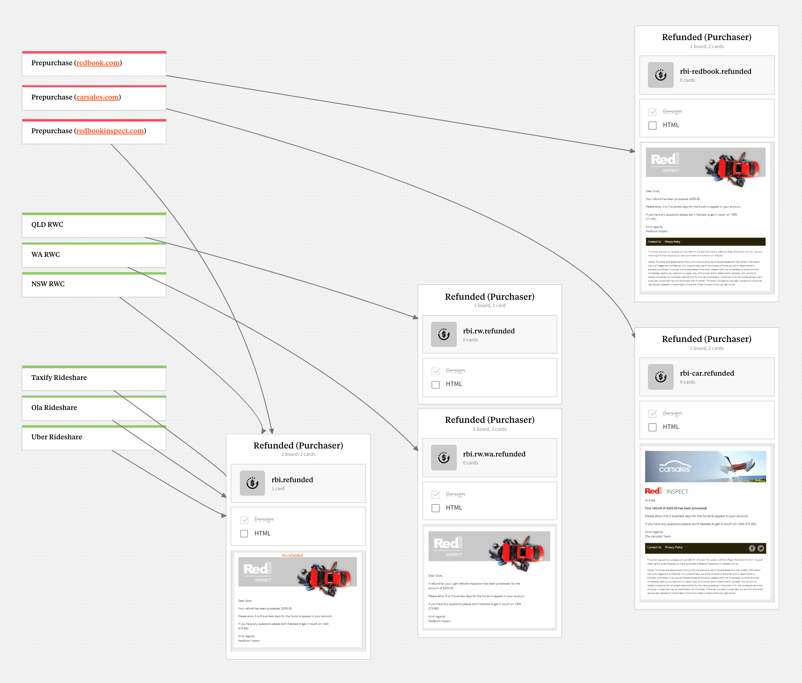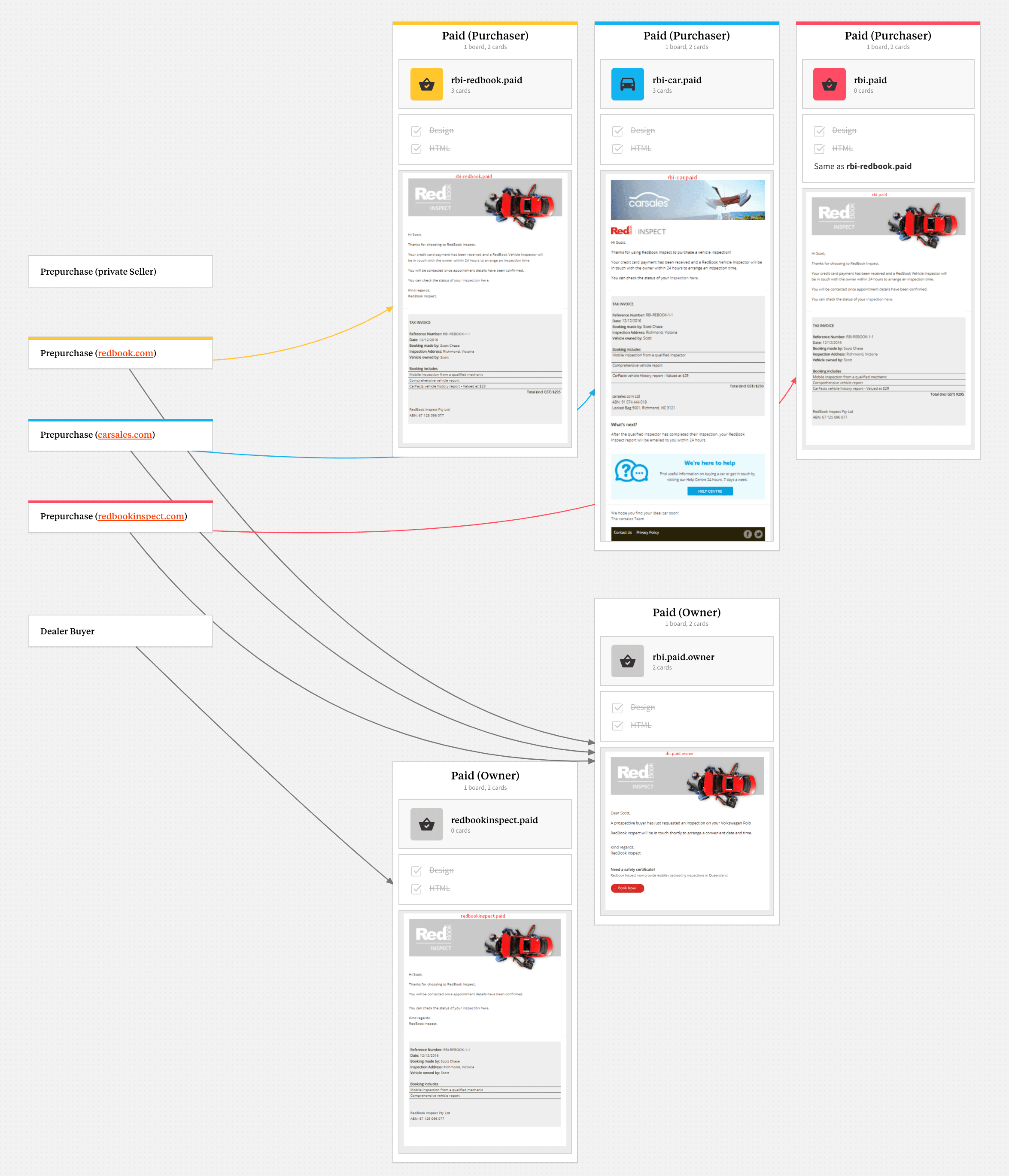 RedBook Inspect had numerous email templates with minor differences, so redesigning each one individually wasn't efficient. Instead, we gathered all the existing emails and laid them out on a whiteboard to visualise their flow.
